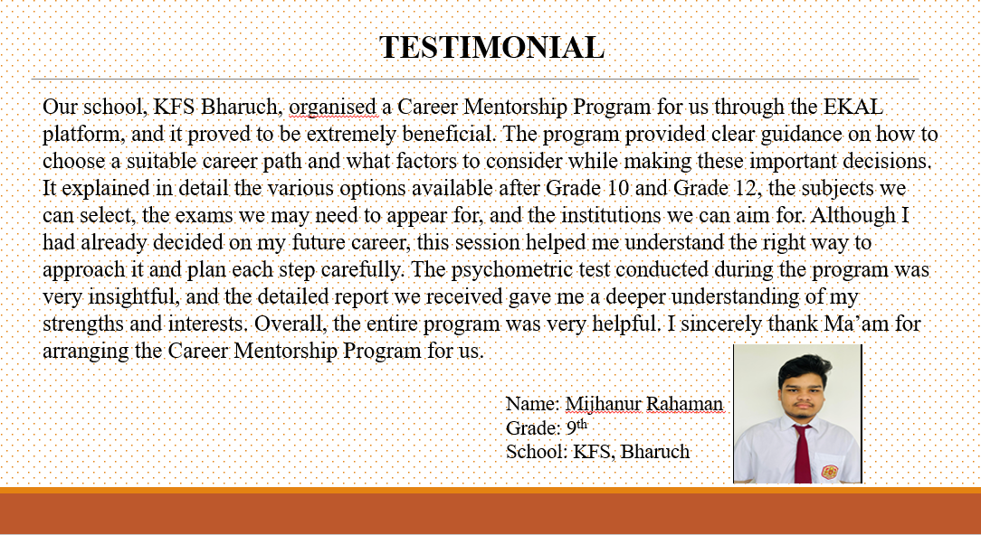 मेरे तीनों बच्चे कैलोरैक्स फ्यूचर स्कूल, भरूच में अध्ययन कर रहे हैं। मेरी बेटी 9वीं कक्षा में है और दोनों बेटे 7वीं कक्षा में हैं। विद्यालय बच्चों की पढ़ाई के साथ-साथ उनकी सुरक्षा और संरक्षा का पूरा ध्यान रखता है। प्रिंसिपल मैडम सभी छात्रों की देखभाल करती हैं और मार्गदर्शन देती हैं। सभी शिक्षक बहुत मेहनत और प्रेम से पढ़ाते हैं। मेरे बच्चे इस विद्यालय में पढ़कर खुश हैं। विद्यालय स्वच्छ, सुव्यवस्थित और हरित वातावरण से परिपूर्ण है।